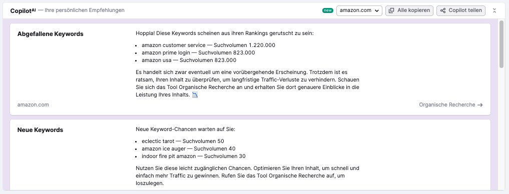 - Mitbewerber beobachten: Copilot überwacht kontinuierlich die Rankings deiner Mitbewerber und verschafft dir so den nötigen Vorsprung.