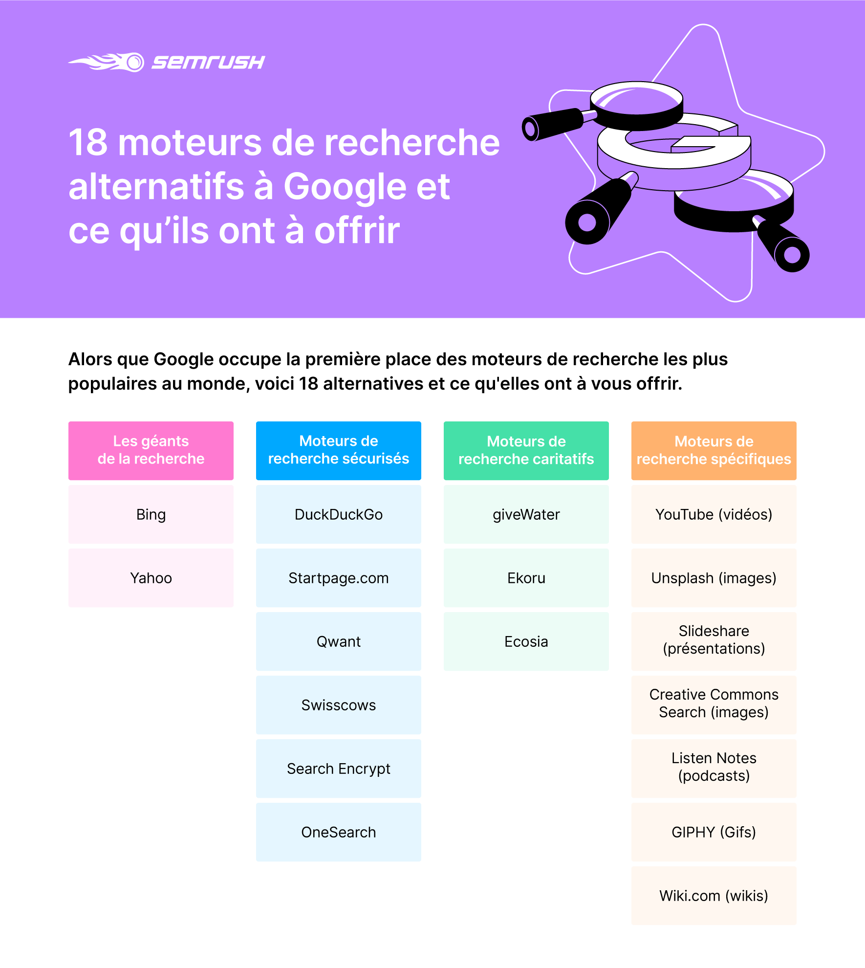Il n'est pas non plus surprenant que ce soit sur Google que la plupart des spécialistes SEO concentrent leurs efforts ; mais en ignorant les autres alternatives, vous pouvez passer à côté d'opportunités de générer du trafic. Google ne convient pas pour tout et à tout le monde, c’est la raison pour laquelle nous avons compilé une liste de moteurs de recherche alternatifs, répertoriant aussi bien les plus que les moins connus :