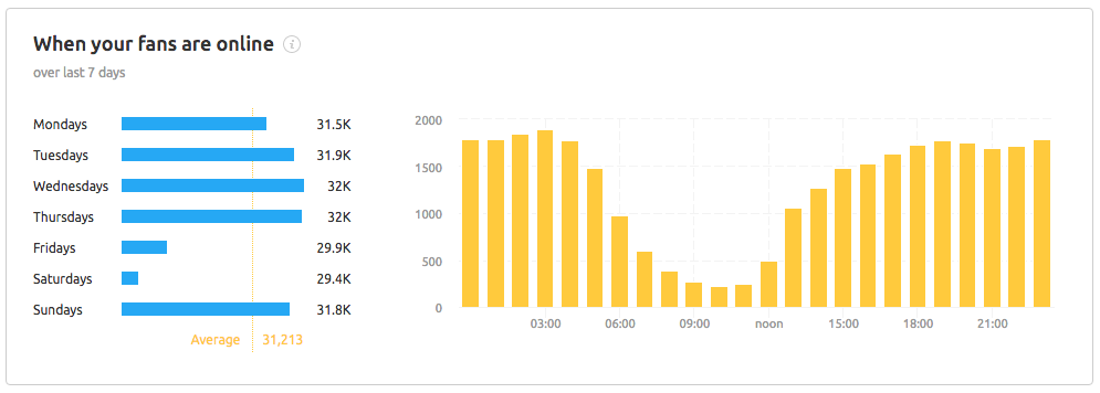 Na aba "Google Analytics", você pode ver estatísticas sobre o desempenho, o perfil do público-alvo e o comportamento de sua página no Instagram ou no Facebook para entender quando seu público-alvo está on-line e qual é a melhor hora para publicar posts.